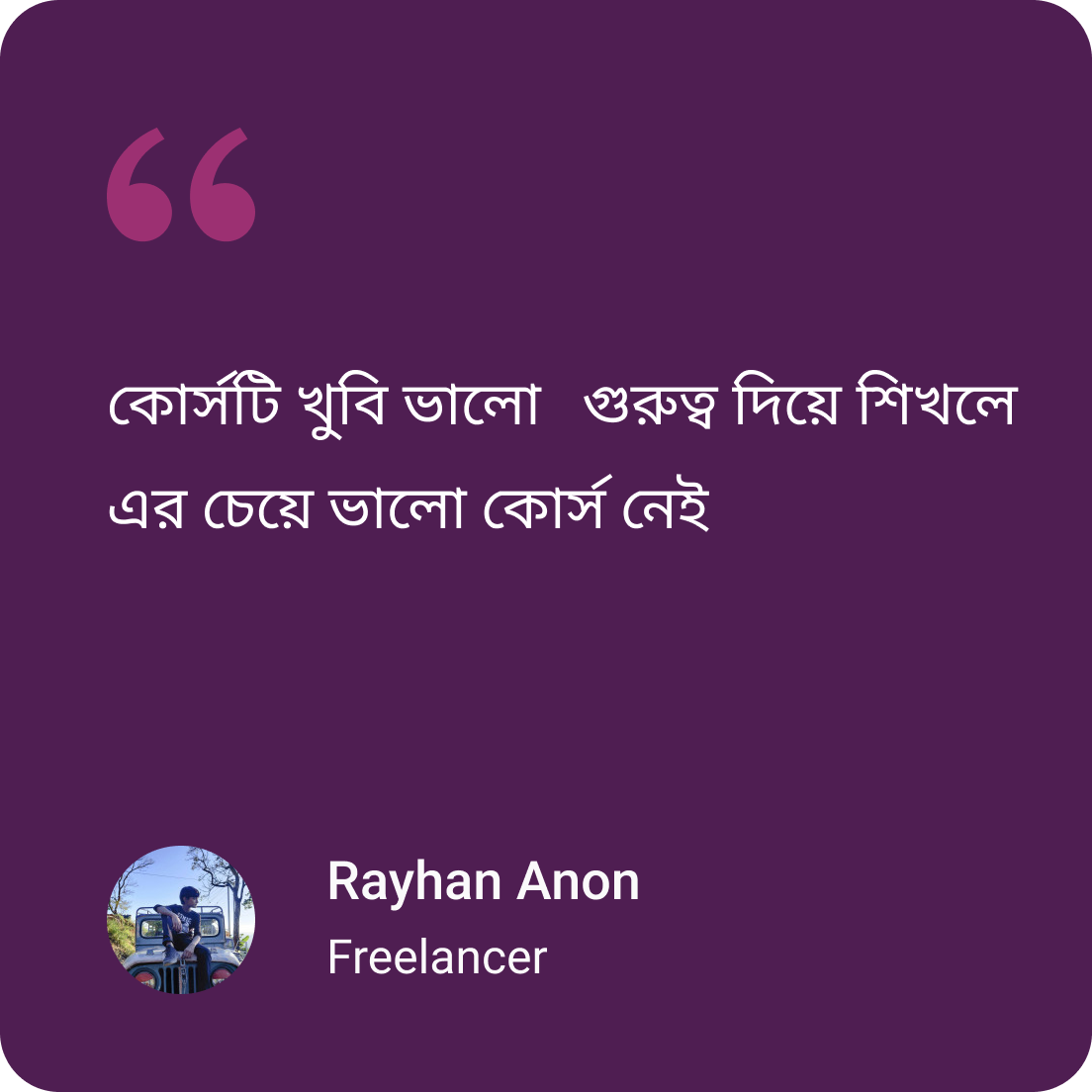 কোর্সটি এনরোল করার পর সাথে সাথেই শেখা শুরু করতে পারবেন, এবং প্রতিটি ভিডিও লিসনের সাথেই মেন্টরকে মেসেজ করতে পারবেন, ফলে শিখবেন ঘরে বসেই, দেশের যেকোনো প্রান্ত থেকে।